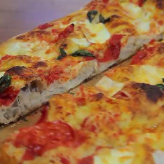 This traditional pizza is often thick crusted and rectangular in shape with a soft inside and crunchy base. Also known as deep dish pizza derived from the Sicilian "Sfincione".